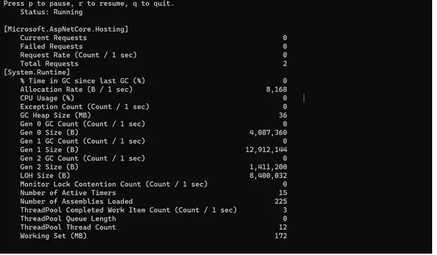 dotnet counters monitor -p ProcessId Systen.Runtime Microsoft.AspNetCore.Hosting